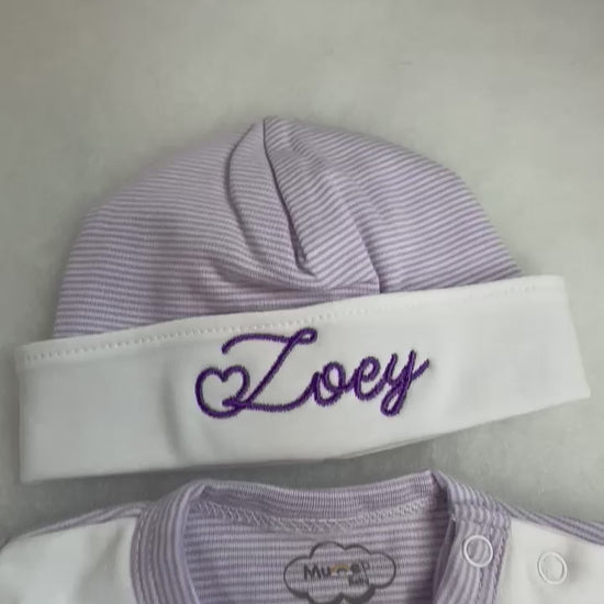 Lavender Tiny Stripe Bib Front Footie and Hat